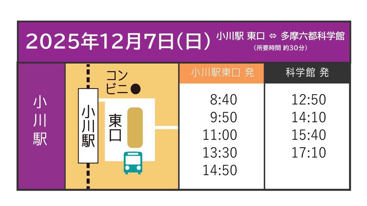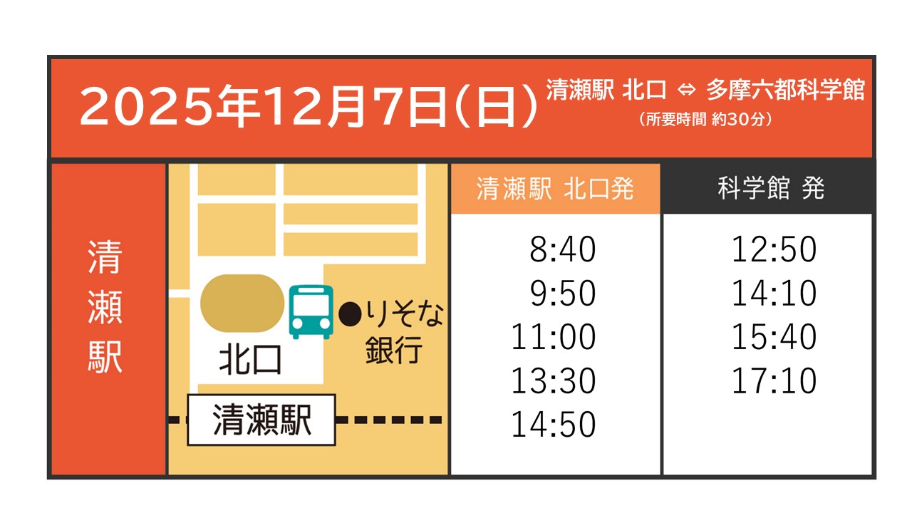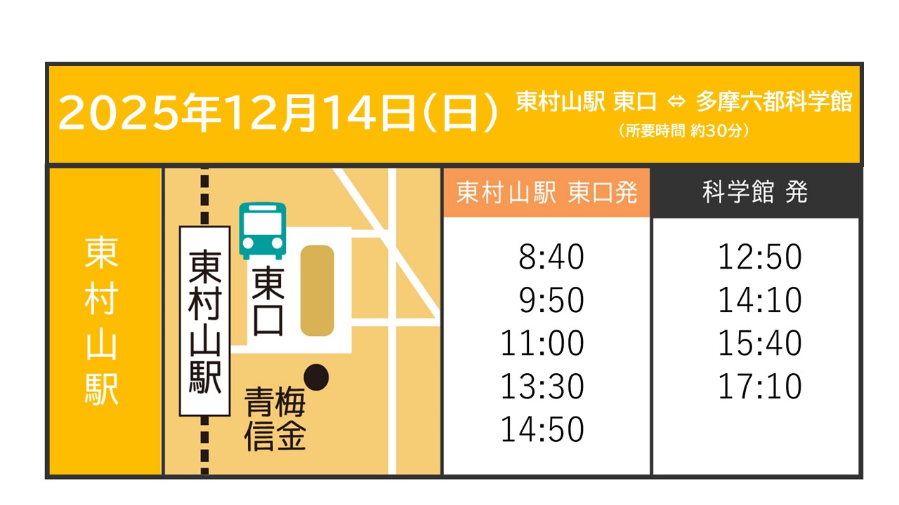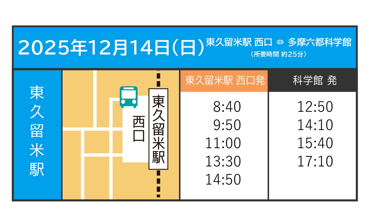2 無料シャトルバスを運行します。下記の駅と多摩六都科学館を結ぶシャトルバスです。運行時刻をご確認のうえ、ぜひご利用ください。