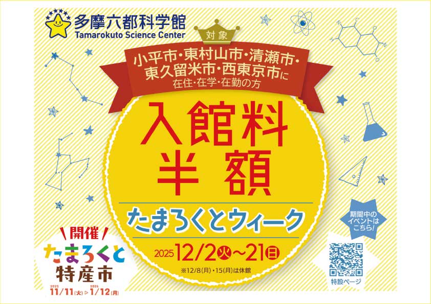 多摩六都科学館は、小平市、東村山市、清瀬市、東久留米市、西東京市の5市で運営しています。5市の市民の方へ感謝を込めて、次の内容でたまろくとウィークを実施します。皆様のご来館をお待ちしています。